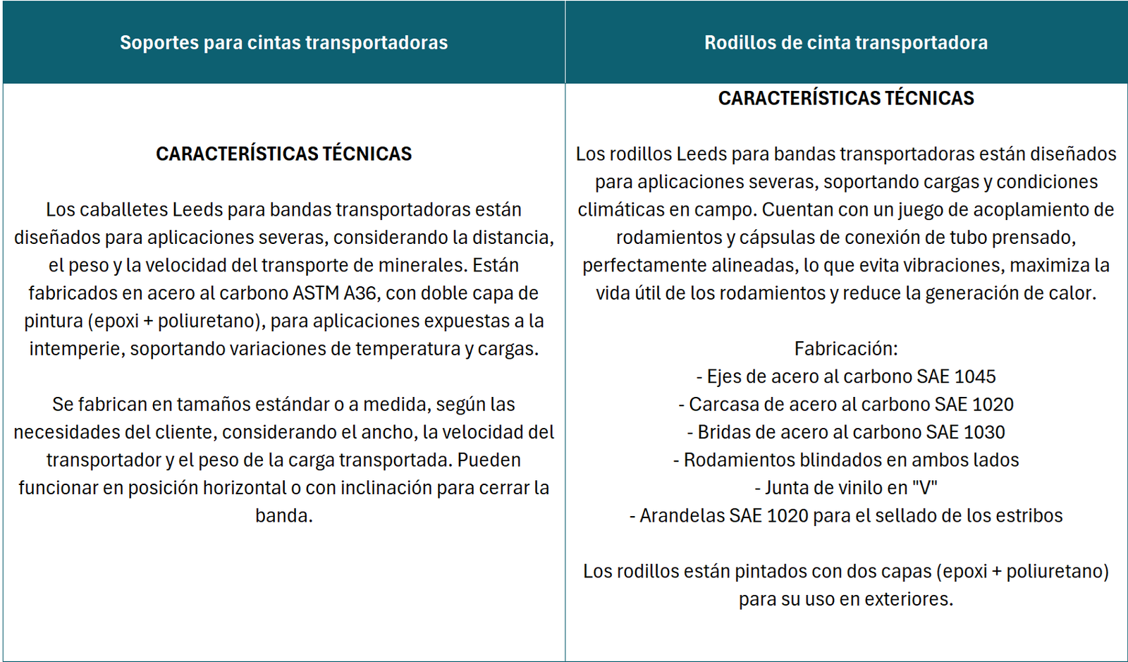 Los caballetes Leeds para bandas transportadoras están diseñados para aplicaciones severas, considerando la distancia, el peso y la velocidad del transporte de minerales. Están fabricados en acero al carbono ASTM A36 con doble capa de pintura (epoxi + poliuretano) para aplicaciones expuestas a la intemperie, soportando variaciones de temperatura y cargas.